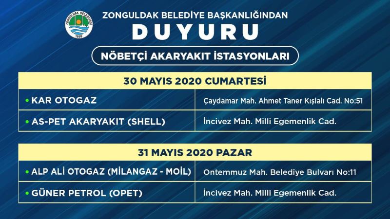 30/31 Mayıs tarihlerinde uygulanacak olan sokağa çıkma kısıtlaması boyunca nöbetçi olarak hizmet verecek olan akaryakıt istasyonlarının listesi aşağıdadır.