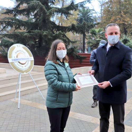 Başkan ALAN daha sonra çelenk koyma törenine katıldı ve ardından emekliliğe ayrılan öğretmenlerimize teşekkür belgelerini takdim etti.