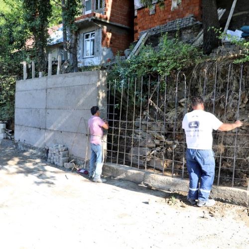 Ekiplerimiz Hüseyin Öztek Sokak'ta parke kaplama yol çalışmasında sona yaklaşmak üzereyken diğer yandan sokak üzerinde olası toprak kaymalarını önlemek amacıyla iki farklı noktada istinat duvarı inşaatını ve yine sokak boyunca briket duvar örme işlerini sürdürüyorlar.
