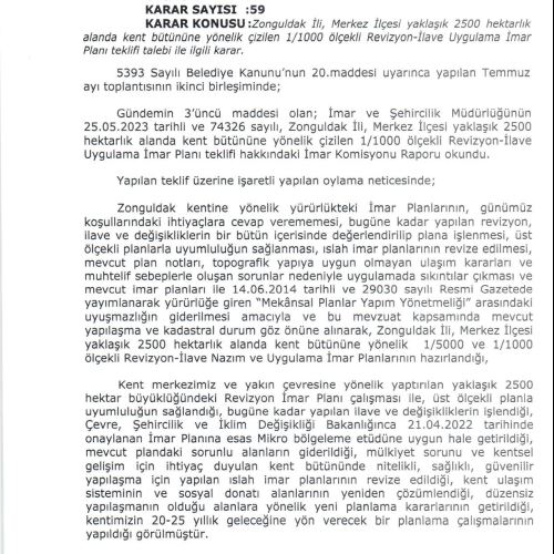 Zonguldak Merkez İlçesi kent bütününü kapsayan REVİZYON - İLAVE İMAR PLANLARI 1/5000 ölçekli Revizyon - İlave Nazım İmar Planı 1/1000 ölçekli Revizyon - İlave Uygulama İmar Planı